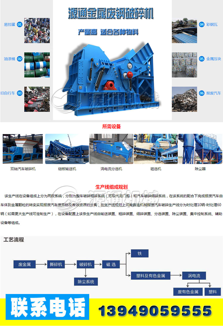當(dāng)今社會(huì),生活節(jié)奏越來(lái)越快,在快速消費(fèi)品充斥的今天,每天都有很多生活垃圾被廢棄。比如廢舊易拉罐,廢薄鐵皮,廢鐵渣,露露灌,八寶粥罐,和其正罐,金屬瓶,易拉罐,可樂(lè)罐,飲料罐,啤酒罐,紅牛罐,油漆桶,月餅盒,罐頭盒等,甚至一些被淘汰的自行車(chē),摩托車(chē),小轎車(chē),這些都是一些金屬垃圾。由于金屬制品的腐蝕、損壞和自然淘汰,每年都有大量的廢舊金屬產(chǎn)生。如果隨意棄置這些廢舊金屬,既造成了環(huán)境的污染,又浪費(fèi)了有限的金屬資源,為此,如何合理利用廢舊金屬使得廢舊金屬粉碎機(jī)應(yīng)運(yùn)而生。